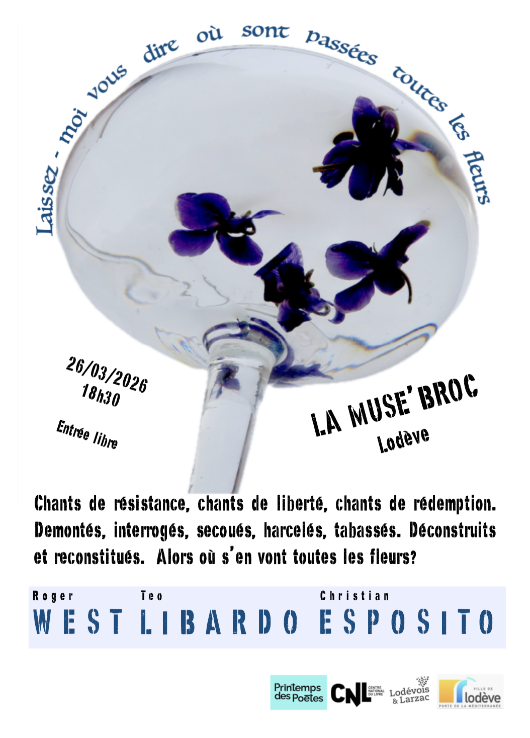 March 26 2026. ‘Laissez-moi vous dire où sont passés toutes les fleurs’ (‘Let me tell you where all the flowers have gone’). La Muse’Broc, Lodève, France. 18.30. A deconstruction of some well-known songs of protest and resistance. With text by me and music by Teo Libardo on guitar and Christian Esposito on percussion. Part of Printemps des Poètes.